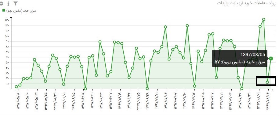 همچنین روز شنبه 57 میلیون یورو ارز توسط صرافیها به واردکنندگان به فروش رسیده است. این در حالی است که به نظر میرسد، برای نخستین بار در روز جمعه نیز معاملات(فروش) در سامانه انجام شده و در روز 3آبان ماه حدود 12 میلیون یورو ارز از سوی واردکنندگان خریداری شده است. نرخ میانگین فروش ارز به واردکنندگان در روز جمعه حدود 9900 تومان بوده است.