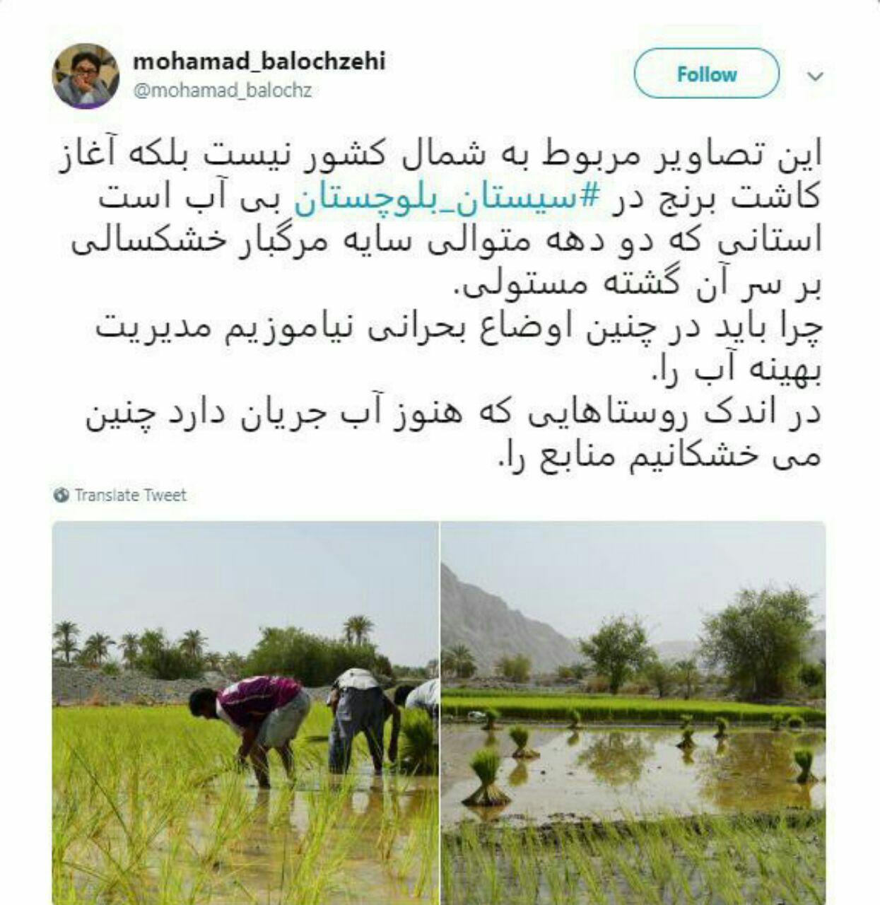 محمد بلوچ زهی، بخشدار مرکزی نیکشهر در استان سیستان و بلوچستان در توییتی به کاشت برنج در سیستان و بلوچستان اعتراض کرد.
