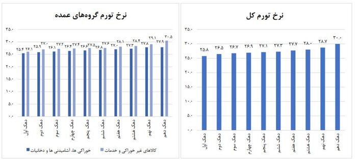 طبق اعلام مرکز آمار محدوده تغییرات تورم دوازده ماهه در گروه عمده «خوراکی‌ها، آشامیدنی‌ها و دخانیات» بین ٢٥.٤ درصد برای دهک اول تا ٢٧.٩ درصد برای دهک دهم است. هم چنین در مورد گروه عمده «کالاهای غیر خوراکی و خدمات» بین ٢٦.١ درصد برای دهک اول تا ٣٠.٥ درصد برای دهک دهم است.