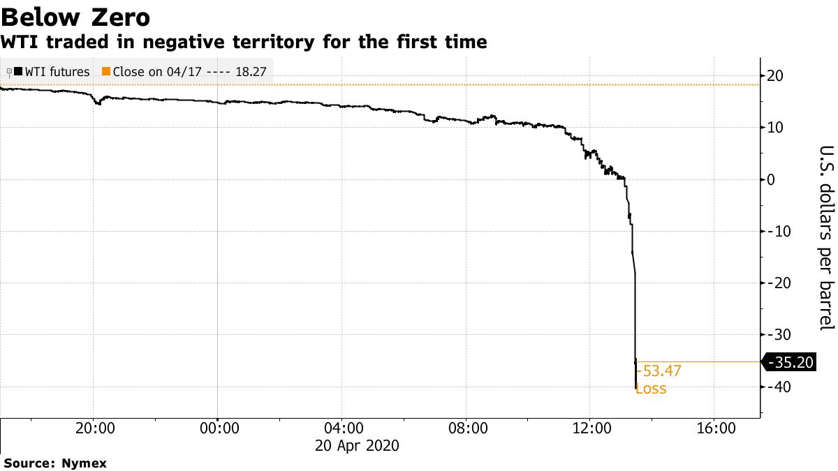 نمودار زیر که از خبرگزاری بلومبرگ برداشته شده است، با عنوان «زیر صفر» روند قیمت نفت آمریکا را در ۲۰ آوریل نشان میدهد: