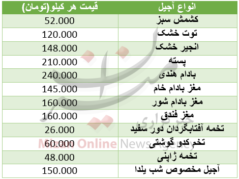 از انواع آجیل و خشکبار شب چله میتوان به توت، نخودچی، تخمه ژاپنی، آفتابگردان، کشمش، پسته، بادام و ... اشاره کرد که با یک حساب سر انگشتی و مشاهده آجیل فروشیهای سطح شهر برای خرید یک کیلو آجیل شیرین شب چله باید حدود ۱۵۰ هزار تومان هزینه کرد که این رقم در سال گذشته نهایتا کیلویی ۵۵ هزار تومان بوده که شاهد افزایش ۳ برابری قیمتها در سال جاری هستیم؛ آجیل تنها گوشهای از مخارج شب چله را نشان میدهد در کنار خرید آن باید میوه، شیرینی، برای تازه عروسها گل آرایی و تزئینات را نیز به آن اضافه کرد که به نظر میرسد حقوق یک کارمندان جز، تنها برای مخارج ۳۰ روز آذر ماه کفاف دهد.