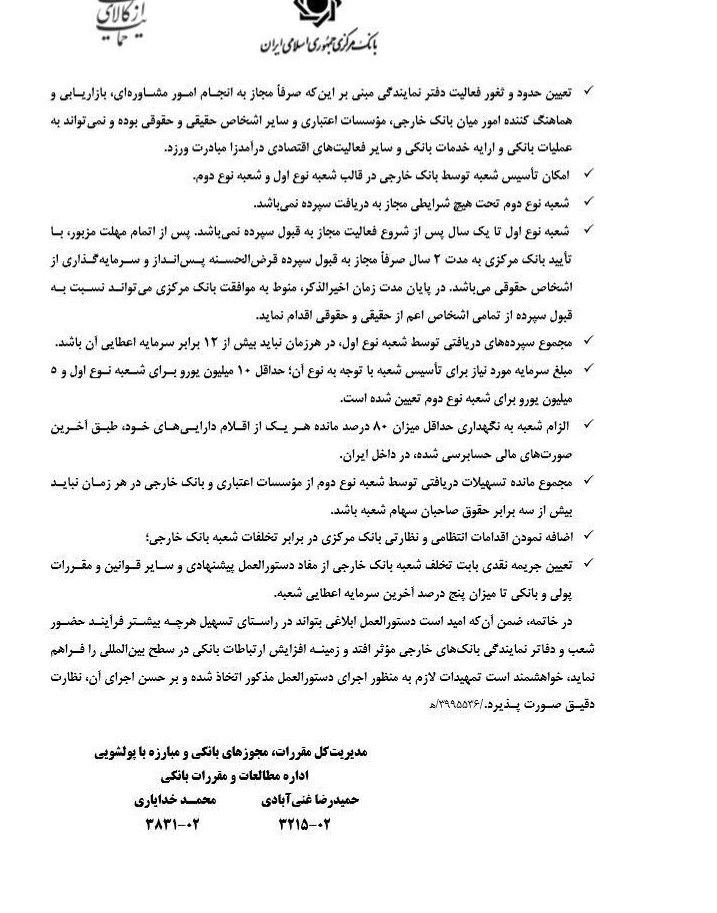 دستورالعمل نحوه تاسیس، فعالیت و تعطیلی شعبه و دفتر نمایندگی بانک خارجی در ایران ابلاغ شد.