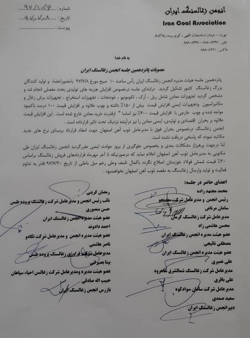 با عنایت به موارد مذکور و مشکلات معادن ذغال سنگ که بارها به صورت مکتوب اعلام گردیده است در پانزدهمین جلسه انجمن ذغال سنگ ایران مورخ 8 مهرماه امسال این مواد مطرح و اعضای هیئت مدیره انجمن ذغال سنگ به همراه سایر تولیدکنندگان ذغال سنگ بزرگ کشور که بیش از 50 درصد تولیدکنندگان ذغال سنگ را شامل میشوند مصوب کردند با توجه به افزایش هزینههای معادن و نرم جهانی قیمت ذغال سنگ و شمش فولاد و همچنین بررسیهای اقتصادی انجام شده قیمت پایه کنستانتره ذغال سنگ تولیدی را برمبنای بهای 30 درصد شمش فولاد تعیین نمایند و در صورتی تا آخر مهرماه در این خصوص قراردادها اصلاح نگردد با کمال تأسف از تاریخ 30 مهرماه قادر به تداوم فعالیت و تولید و ارسال ذغال سنگ به مقصد ذوب آهن اصفهان نخواهند بود.