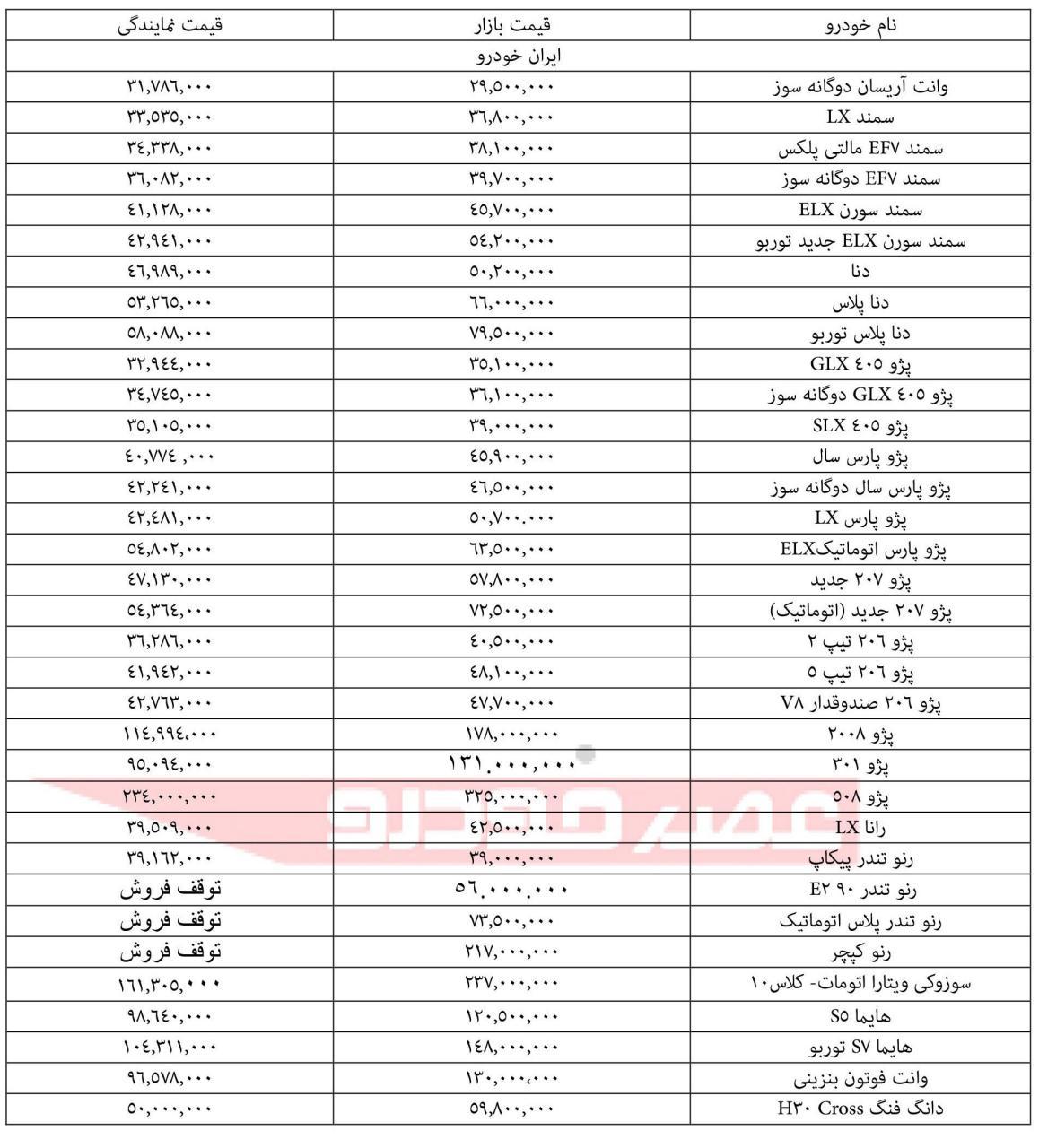 قیمت انواع محصولات ایران خودرو در بازار و نمایندگی اعلام شد.