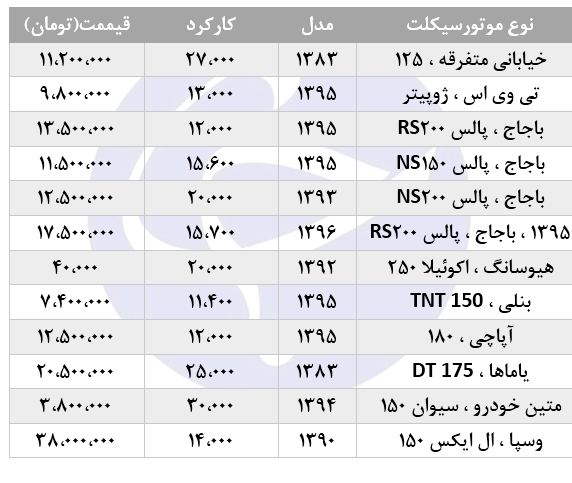 قیمت انواع موتورسیکلت با کارکرد ۱۰ تا ۳۰ هزار کیلومتر