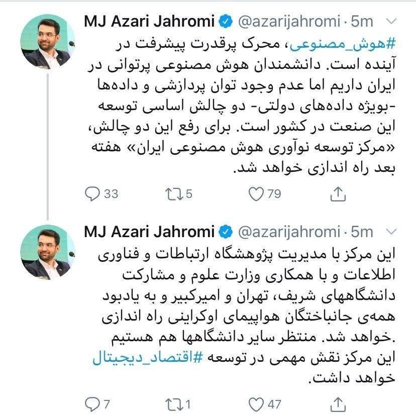 وزیر ارتباطات در پیامی توئیتری خبر داد: هوش مصنوعی محرک پرقدرت پیشرفت در آینده است. دانشمندان هوش مصنوعی پرتوانی در ایران داریم اما عدم وجود توان پردازشی و داده ها به ویژه داده های دولتی دو چالش اساسی توسعه این صنعت در کشور است. برای رفع این دو چالش "مرکز توسعه نوآوری هوش مصنوعی ایران" هفته بعد راه اندازی خواهد شد.