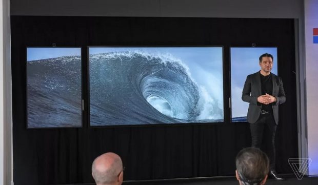 همچنین نسخه کوچکتر، امکان نمایش محتوا به صورت کاشیوار را با چهار پنل 50 اینچی ساید-بای-ساید فراهم میکند؛ اما ظاهرا مدل 85 اینچی سرفیس هاب 2 برای کسب و کارهایی طراحی شده است که به دنبال چیز بزرگتری هستند. «پانوس پانای» رئیس بخش سرفیس در شرکت مایکروسافت هنگام معرفی این مانیتور جدید، آن را در حالت به اصطلاح ساندویچ شده بین دو نسخه 50 اینچی هم به نمایش گذاشت.
