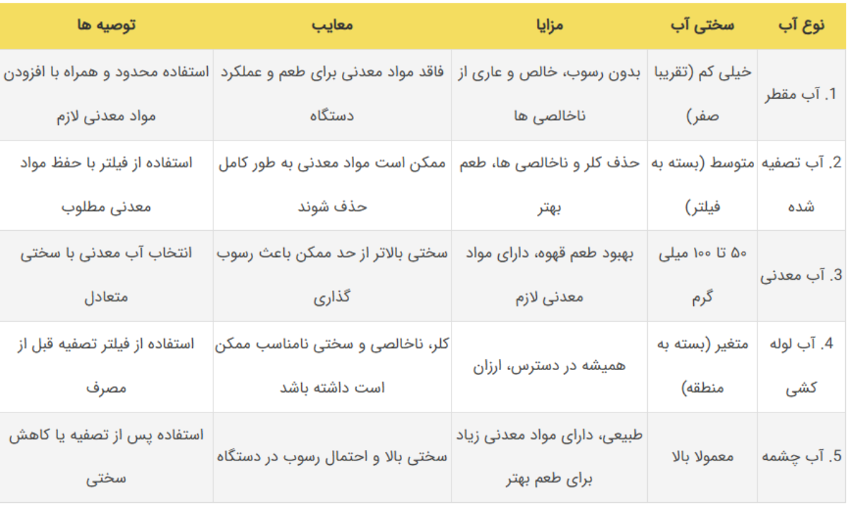 در جدول زیر ویژگی ها و مزایا و معایب هریک از انواع آب ها برای استفاده در دستگاه اسپرسوساز را بررسی کرده ایم.
