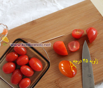 کافی است که از قسمت سر گوجه فرنگی، یک سوم یا یک چهارم گوجه را با زاویه 45 درجه، برش بزنید و دو بخش بزرگ دو گوجه فرنگی را به هم چسبانده و با خلال دندان آنها را کنار هم نگه دارید.