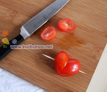 تزیین گوجه به شکل قلب را با استفاده و دقت به تصاویر زیر یاد گرفته و برای تزیین سالاد یا غذای خود استفاده نمایید.
