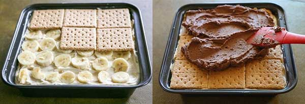 ته ظرف سرو، یک ردیف بیسکویت پتی بور بچینید و از کرم کاکائویی حاصل، روی بیسکویتها بمالید.
