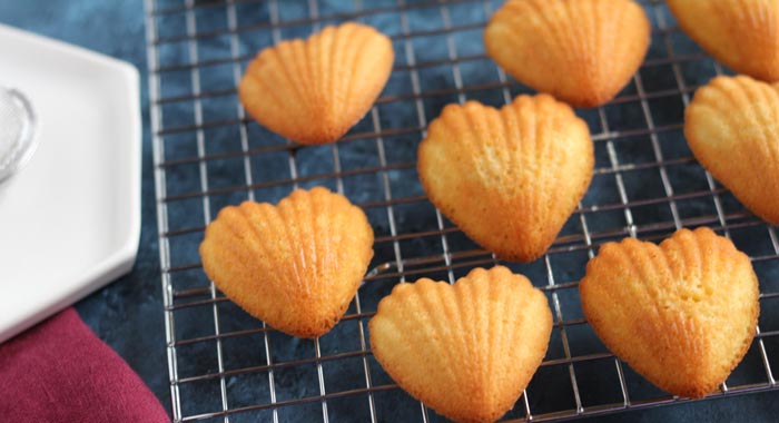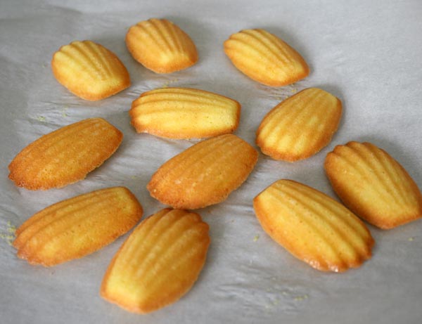 خمیرها را داخل قالبهای صدفی شکل قرار دهید و قالب را درون فر بگذارید. (توجه کنید که کمی از سر قالب را خالی بگذارید، چون این شیرینی در قالب پف میکند.)