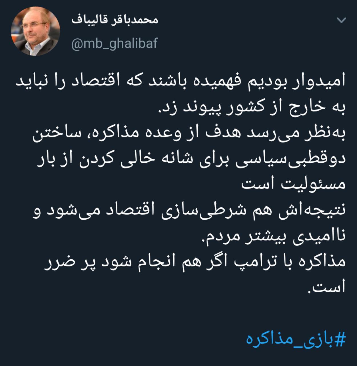 محمدباقر قالیباف با انتشار یک توییت، از اینکه احتمال میرود روحانی و ترامپ دیدار کنن، انتقاد کرد.
