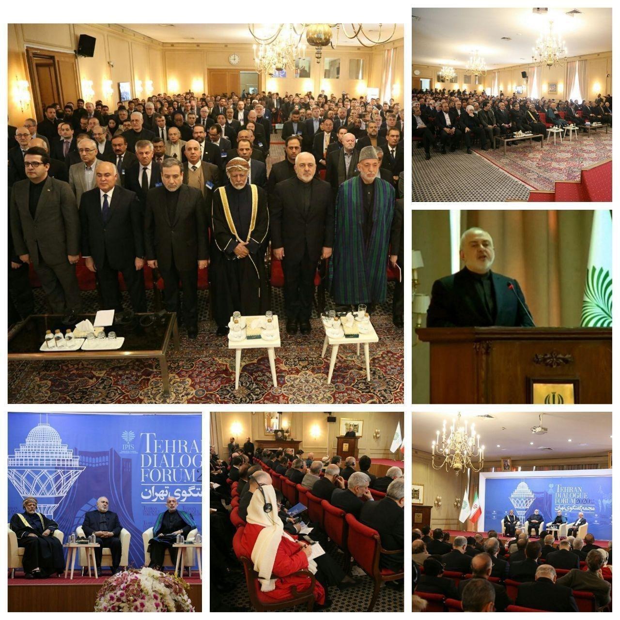 پس از پایان سخنرانی ظریف، حامد کرزای، رئیس جمهور پیشین افغانستان شروع به سخنرانی کرد. وی در ابتدای سخنانش در مجمع گفتوگوی تهران گفت: حمله آمریکا بر جان و زندگی برادر عزیزمان سردار قاسم سلیمانی را بر ملت بزرگوار ایران و دولت تسلیت عمیق عرض میکنم. افغانستان و ایران دو کشور بسیار نزدیک به لحاط تاریخ و فرهنگ هستند. برادران ما در ایران 40 سال است که مهماندار برادران و خواهران افغان خود هستند و اجازه تعلیم و تربیت به آنها دادند.