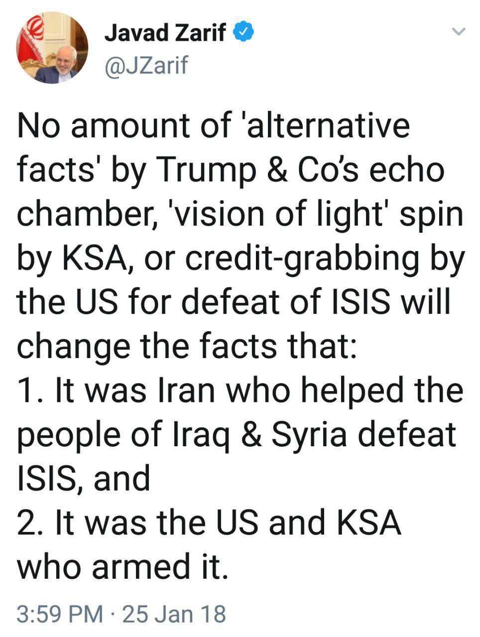 وزیر امور خارجه کشورمان در توییتی در صفحه شخصی خودنوشت: ایران بود که به مردم عراق و سوریه کمک کردتا داعش را شکست دهند.ایالات متحده و عربستان سعودی بودند که این گروه را تسلیح کردند.