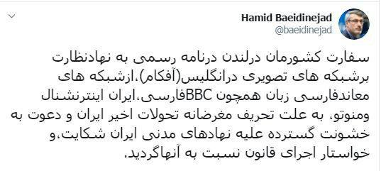 حمید بعیدی نژاد در صفحه توییترش نوشت: سفارت کشورمان در لندن در نامه رسمی به نهاد نظارت بر شبکههای تصویری در انگلیس(آفکام)، از شبکههای معاندفارسی زبان همچون BBCفارسی، ایران اینترنشنال و منوتو، به علت تحریف مغرضانه تحولات اخیر ایران و دعوت به خشونت گسترده علیه نهادهای مدنی ایران شکایت و خواستار اجرای قانون نسبت به آنها گردید.