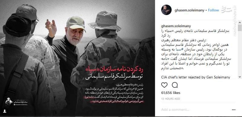 صفحه اینستاگرام سرلشکر قاسم سلیمانی، فرمانده سپاه قدس با انتشار عکسی جدید از وی، به نامه رئیس «سیا» واکنش نشان داد.