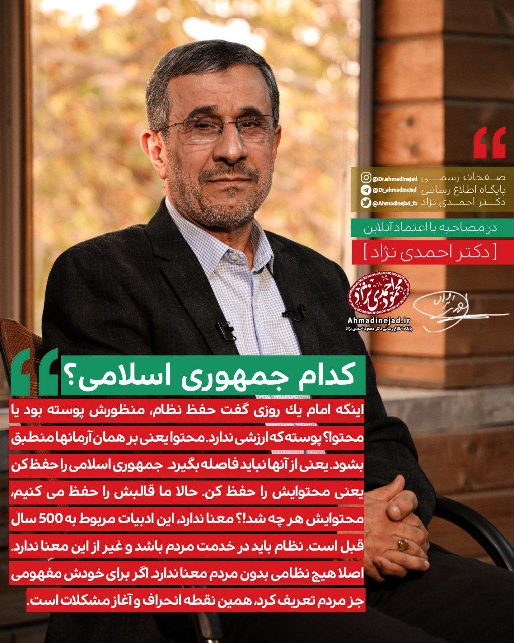 احمدی نژاد در مصاحبه اخیرش گفت: اينكه امام يک روزی گفت حفظ نظام، منظورش پوسته بود يا محتوا؟ پوسته كه ارزشی ندارد. محتوا يعنی بر همان آرمانها منطبق بشود. يعنی از آنها نبايد فاصله بگيرد.