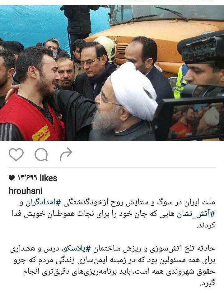 سیاست > دولت - حسن روحانی رییس جمهوری کشورمان تصویری از گفتگوی امروزش با یک آتش نشان را در صفحه اینستاگرامش منتشر کرده است. 2929 منبع: خبرآنلاین 15