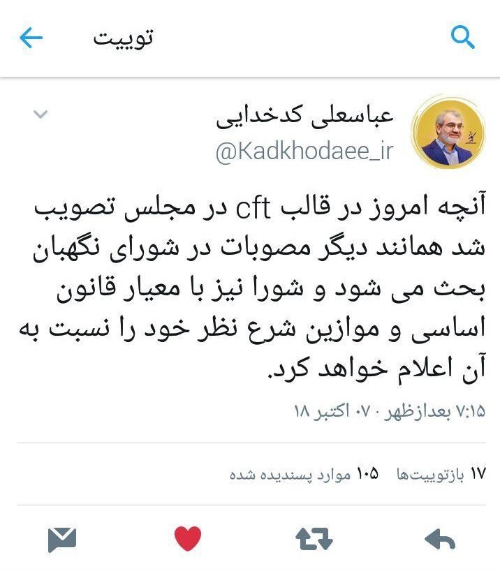 کدخدایی درباره وضعیت بررسی یکی از لوایح (FATF) در شورای نگهبان توضیحاتی ارائه کرده است.