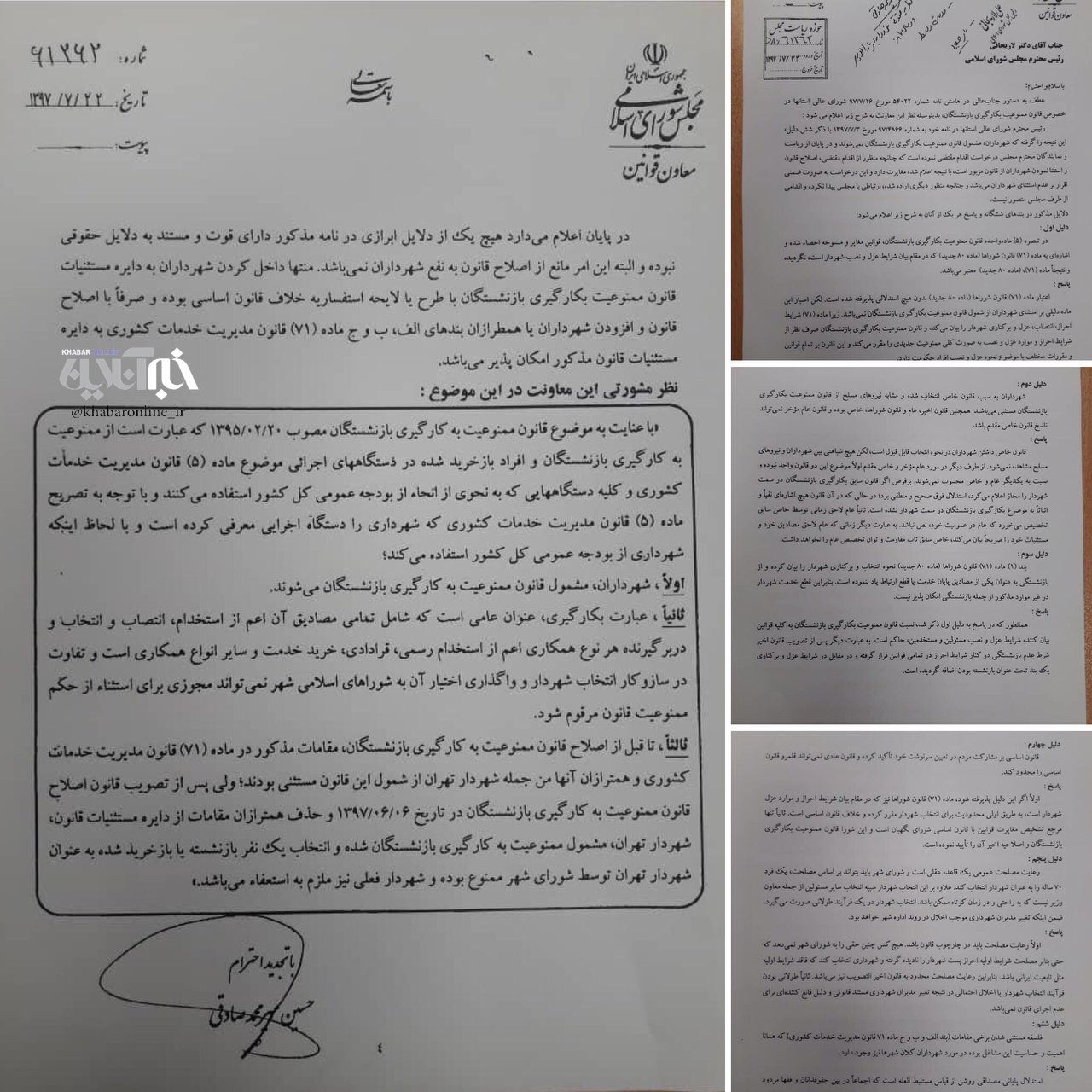 در این نامه تاکید شده است: پس از حذف همترازان مقامات از دایره مستثنیات قانون، شهردار تهران مشمول ممنوعیت بکارگیری بازنشستگان شده و انتخاب یک نفر بازنشسته یا بازخرید شده به عنوان شهردار تهران توسط شورای شهر ممنوع بوده و شهردار فعلی نیز ملزم به استعفا است.
