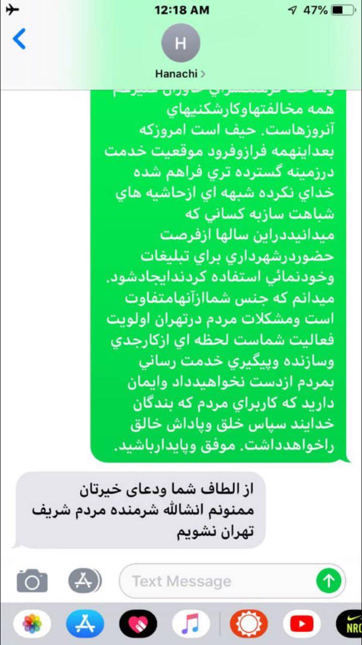 پاسخ حناچی هم پایان بخش این گفتگوی پیامکی بوده که در آن نوشته است؛ از الطاف شما و دعای خیرتان ممنونم. انشاالله شرمنده مردم شریف تهران نشویم.