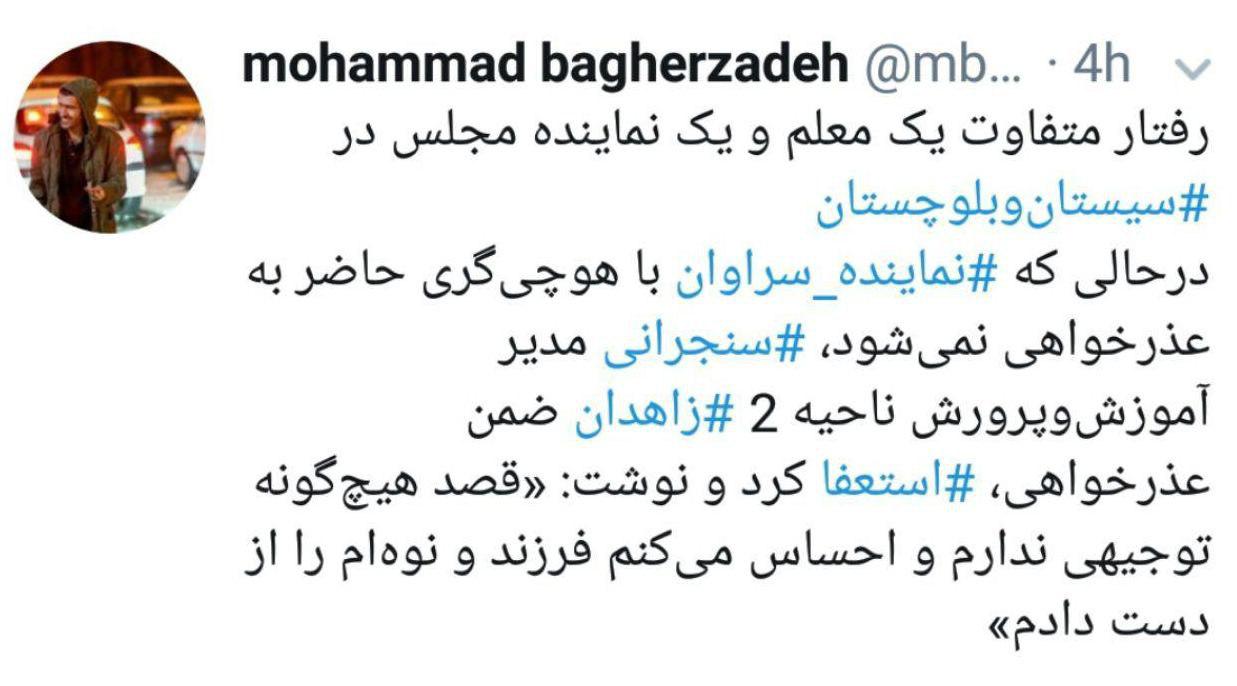 بعد از توهین نماینده سراوان در با یک کارمند یک معلم به علت رفتار نامناسب اعضای خانواده اش از سمت خود استعفا داد.