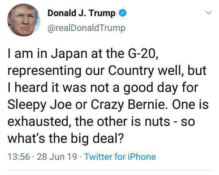 ترامپ نوشت: من به نمایندگی از کشورم در گروه 20 در ژاپن هستم، ولی شنیدم که جوی خواب آلود و برنیِ دیوانه روز خوبی نداشتند. یکی خسته است و دیگری دیوانه - پس این سر و صدا برای چیست؟
