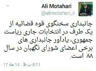 علی مطهری در پاسخ به اظهارات حجتالاسلام محسنی اژه ای در توییت خود نوشت: جانبداری سخنگوی قوه قضائیه از یک طرف در انتخابات جاری ریاست جمهوری، یادآور جانبداری های برخی اعضای شورای نگهبان در سال ۸۸ است.