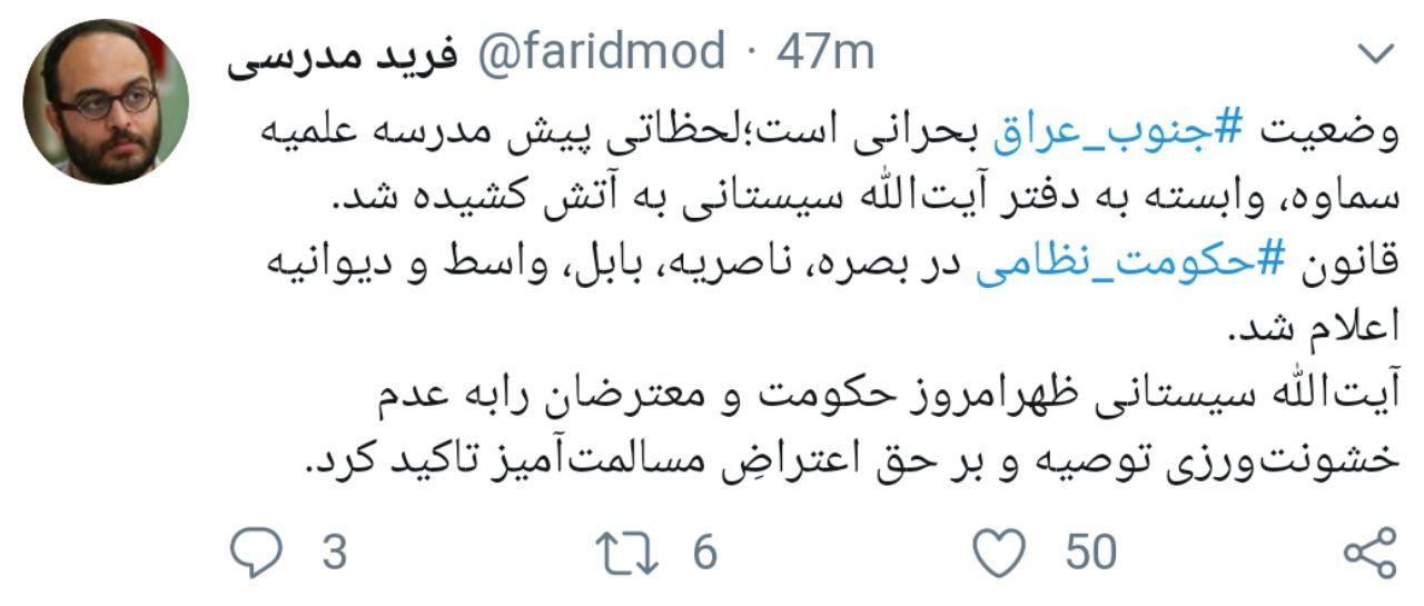 فرید مدرسی، روزنامهنگار نوشت: وضعیت جنوب عراق بحرانی است. لحظاتی پیش مدرسه علمیه سماوه، وابسته به دفتر آیتالله سیستانی به آتش کشیده شد. قانون حکومت نظامی در بصره، ناصریه، بابل، واسط و ديوانيه اعلام شد.