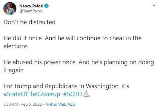 همچنین نانسی پلوسی با اشاره به سخنرانی سالانه دونالد ترامپ در کنگره توئیت کرد: حواستان پرت نشود. او یک بار این کار را انجام داد و بار دیگر نیز در انتخابات تقلب می کند. وی یک بار از قدرت خود سوء استفاده کرد و قصد دارد این کار را ادامه دهد. برای ترامپ و جمهوری خواهان در واشنگتن این سخنرانی وضعیت لاپوشانی است.