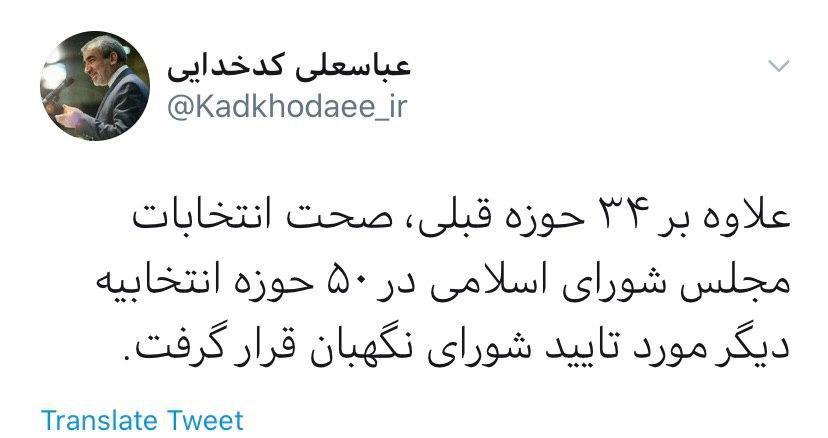 سخنگوی شورای نگهبان در توییتی نوشت: صحت انتخابات مجلس شورای اسلامی در ۵۰ حوزه انتخابیه دیگر مورد تایید شورای نگهبان قرار گرفت.