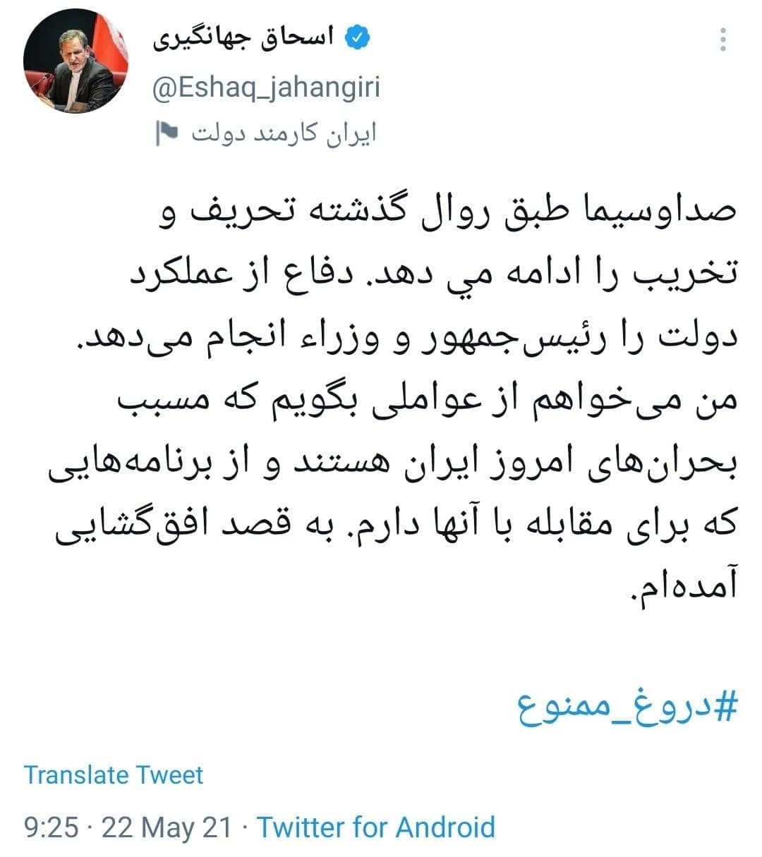 جناب جهانگیری همین توئیت هم که زدی دروغه بس کن،خدا شاهده از بس مردم اذیت شدن فکر نکنم کسی دیگه از سیاست سر در نیاره ما فرق خوب وبد میدونیم