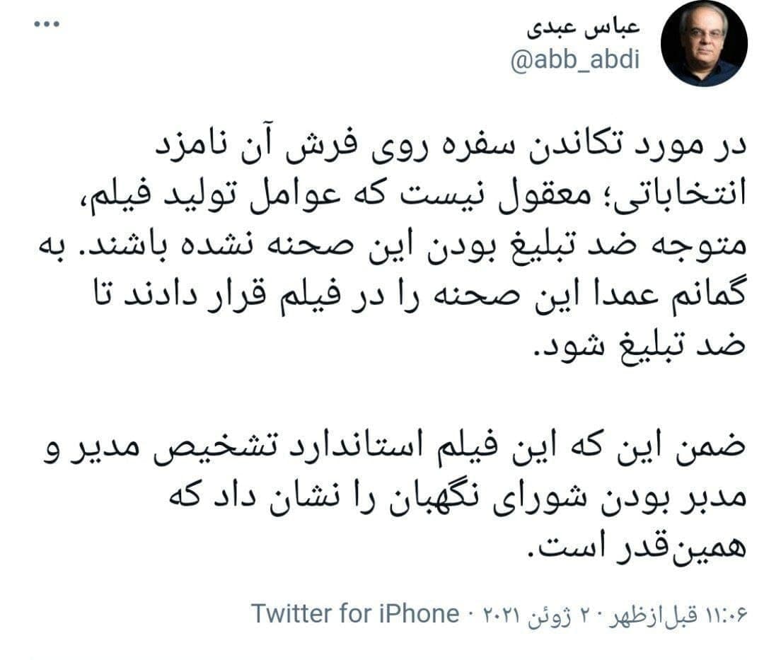 آقای عبدی مطمئنم در زندگیت سفره خالی ندیدی بنابراین باید هم ایراد بگیری و از نظر هنری به مسئله نگاه کنی خیلیدمتاسفم.....