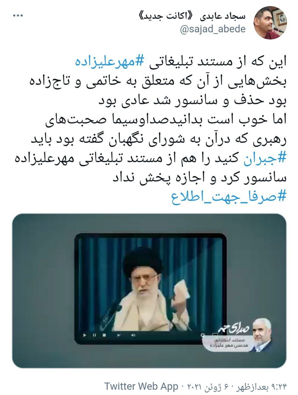 صداوسیما صحبتهای رهبری که درآن به شورای نگهبان گفته بود باید #جبران کنید را هم از مستند تبلیغاتی مهرعلیزاده سانسور کرد.