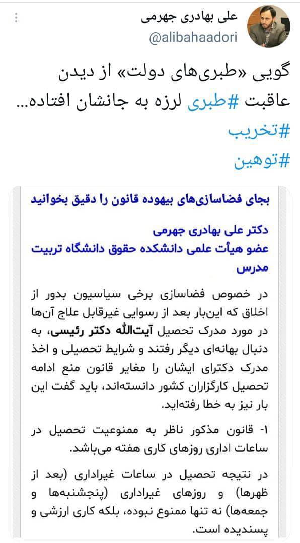 بهادری جهرمی از نزدیکان سید ابراهیم رئیسی در پی تخریب و تهمت های صورت گرفته علیه رییسی ضمن پاسخ حقوقی به این شبهات، توهینها را ناشی از ترس طبریهای دولت دانست که از ترس دچار شدن به سرنوشت طبری، دست به تخریب رییسی میزنند.