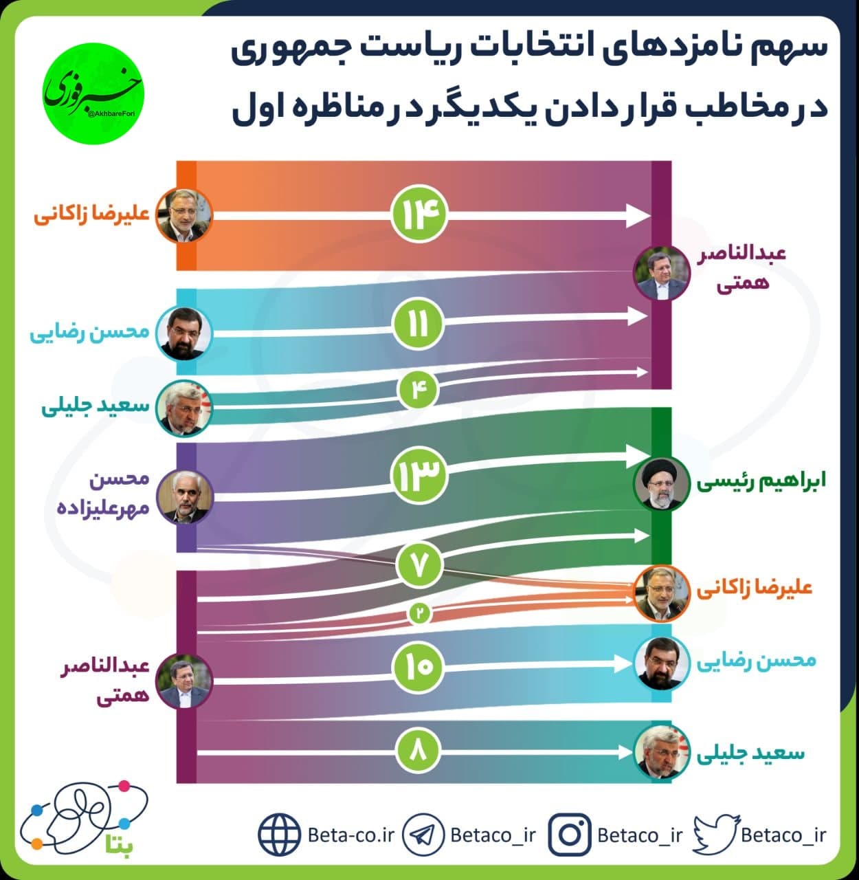 سهم نامزدهای ریاست جمهوری در مخاطب قراردادن یکدیگر در مناظره اول/ اینفوگرافی