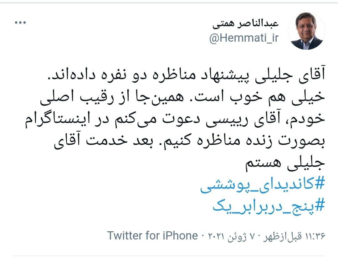 عبدالناصر همتی در واکنش به پیشنهاد مناظره جلیلی: اول مناظره با آقای رئیسی بعد شما