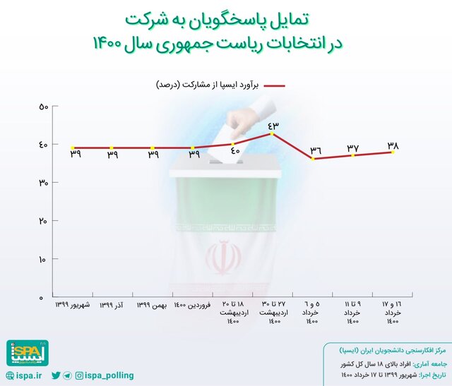 ایسپا همچنین از شهریور ۱۳۹۹ تا ۱۷ خرداد ۱۴۰۰ در مجموع ۹ موج نظرسنجی انتخاباتی با جامعه آماری افراد بالای ۱۸ سال کل کشور اجرا کرده (هشت موج به شیوه مصاحبه تلفنی با اندازه نمونه تقریبی ۱۵۰۰ نفر و یک موج به شیوه مصاحبه حضوری در میادین و معابر با اندازه نمونه ۵۱۵۰ نفر) است که بر اساس آخرین نتیجه این نظرسنجی‌ها، مشارکت شهروندان در انتخابات ریاست جمهوری بعد از برگزاری اولین مناظره ۳۸ درصد محاسبه شده است.