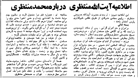 سهشنبه، ۲۷ شهریور ۱۳۵۸، آیتالله منتظری اطلاعیهای را درباره فرزندش محمد منتظری خطاب به مردم منتشر کرد. این اطلاعیه که از طریق تلکس خبرگزاری پارس انتشار یافت بدین شرح بود: