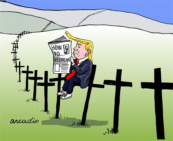 آرکادیو اسکیوال با انتشار کارتونی در سایت کگل به سوء‌مدیریت و تصمیمات اقتصادی اخیر دونالد ترامپ در بازگشایی اقتصاد آمریکا که موجب از بین رفتن تعداد بسیاری از مردم این کشور خواهد شد، پرداخت.
