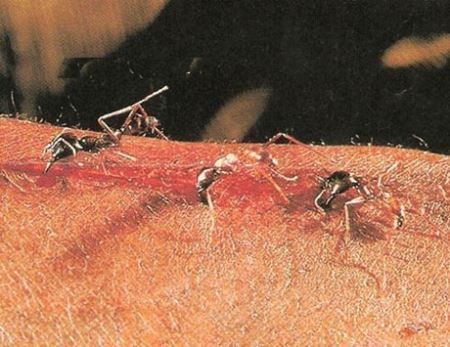 ارتش مورچه های سرباز که با سر بزرگ خود شناخته شده اند با جدال بر سر گوشت شما و مبارزه با یک دیگر باعث بخیه خوردن زخم میشوند و خودشان در میان زخم ها کشته میشوند، البته درد آور بودن این درمان امری بدیهی است و فردی که مورچه ها در حال بخیه زدن آن هستند درد زیادی را تحمل می کند.