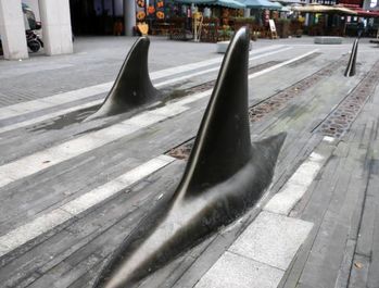 چینیها یک ردیف از باله کوسه در وسط پیادهرو یک پارک نصب کرده اند. این بالههای کوسه، مسیرهای دو طرف را در روزهای شلوغ جدا میکنند.