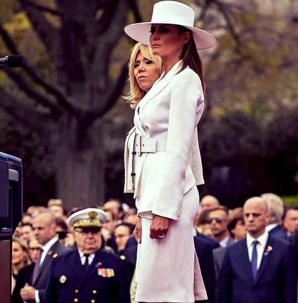 در آوریل سال 2018 ترامپ به فرانسه برای دیداری رسمی امانوئل مکرون رئیس جمهور فرانسه و همسرش سفر کرد.در دومین روز از دیدار خانم ترامپ یک دامن با لباس زنانه سفید با یک کلاه لبه پهن پوشیده بود. افکار عمومی درگیر لباس او شدند، اما برخی گفتند که ریشه های اروپایی دارد، در حالی که دیگران به شباهت آن با امضای بیونس اشاره می کردند.