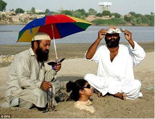 یکی دیگر از سنّت های عجیب و غریب هندی ها، دفن کردن کودکان معلول زنده تا گردن به مدّت شش ساعت، در طول خورشید گرفتگی می باشد. هندوها می گویند که انجام این کار برای خنثی کردن اثرات سوء ناشی از خورشید گرفتگی می باشد.