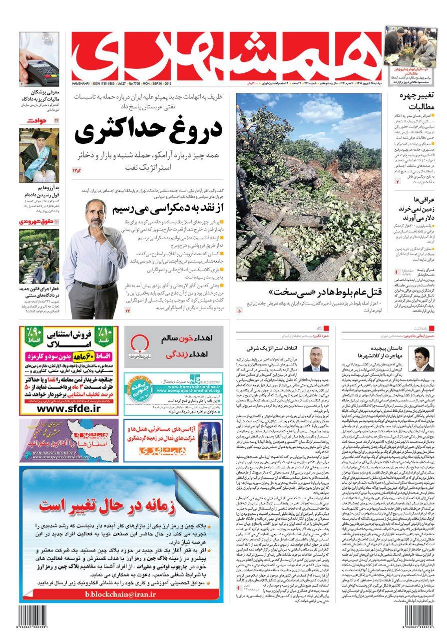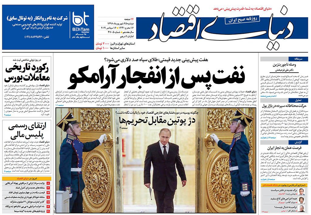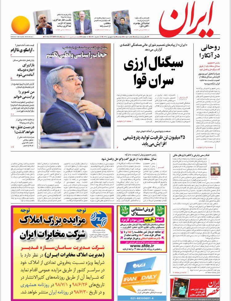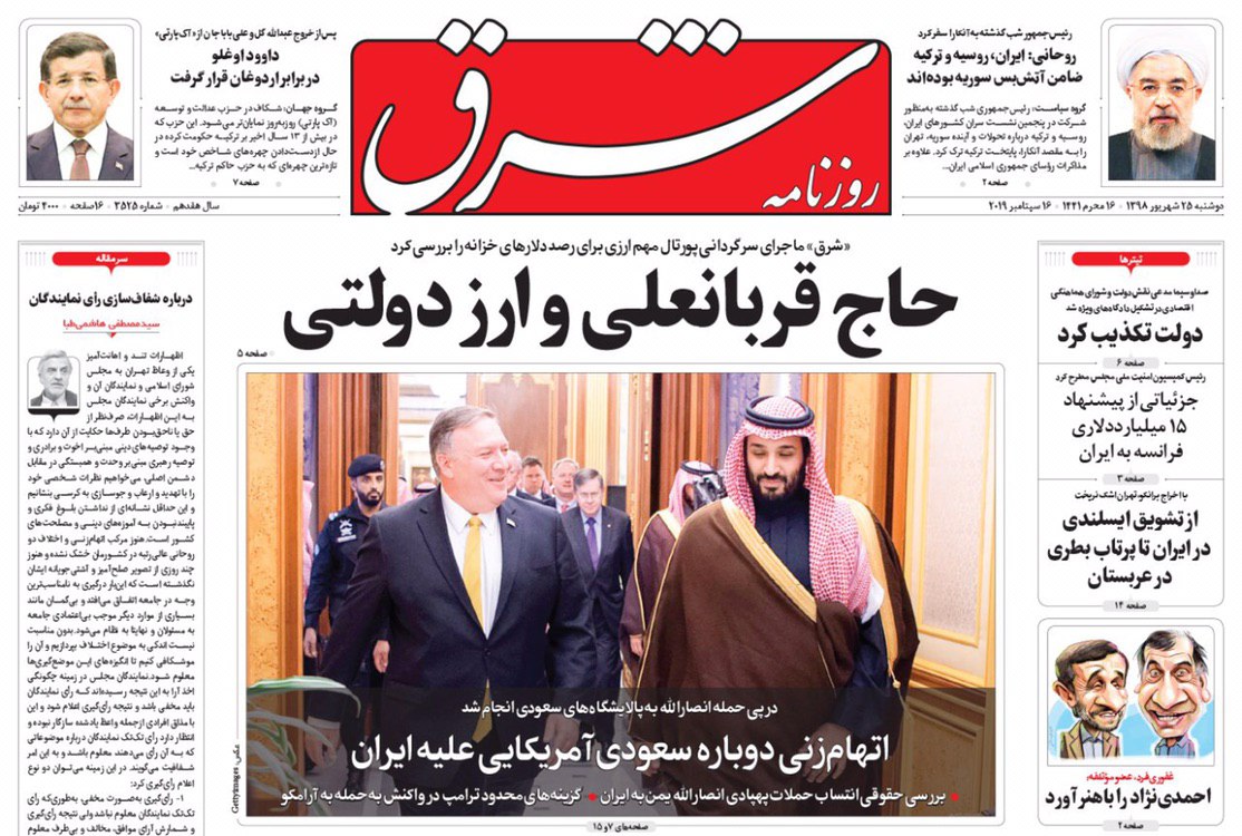 روزنامه‌های امروز موضوعات مختلفی را در صفحه یک خود برجسته کردند. از اختلاف روحانی و رئیسی بر سر دادگاه‌های مبارزه با مفاسد اقتصادی تا دروغ آمریکا درباره نقش ایران در حمله به عربستان.