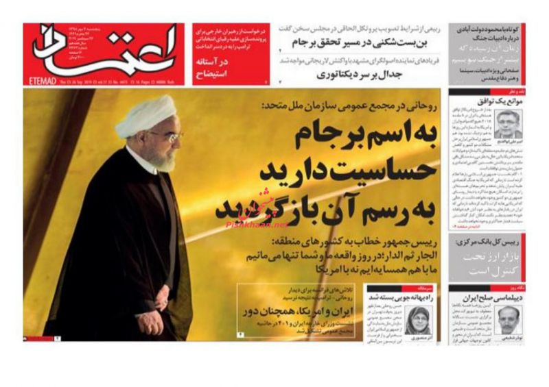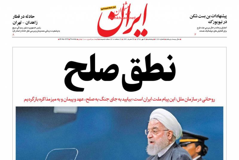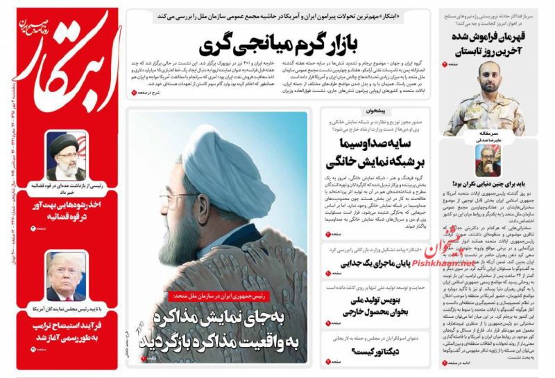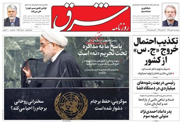 نطق صریح رویس جمهور کشورمان در سازمان ملل، دیدارهای روحانی با رؤسای کشورهای مهم جهان، تصویب تأسیس وزارت بازرگانی در مجلس و... از موضوعات اصلی مطبوعات امروز است.