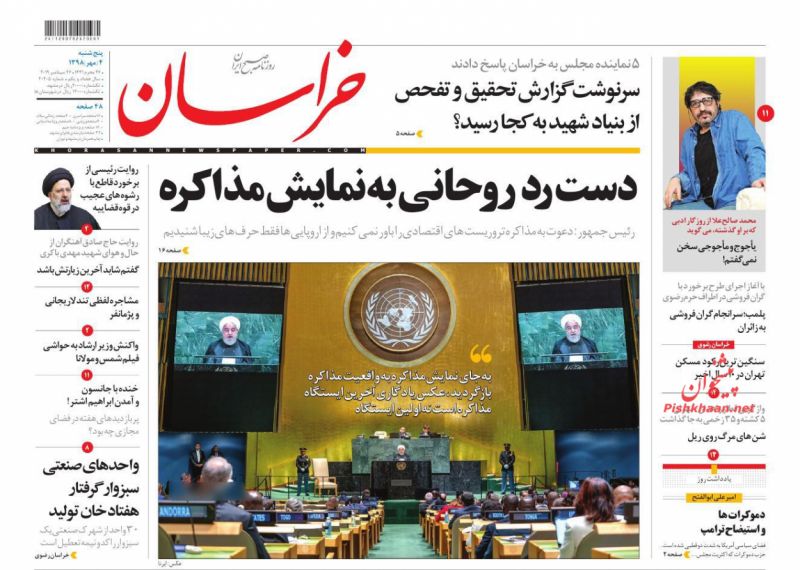 صفحه نخست روزنامه‌های پنج‌شنبه ۴مهر۱۳۹۸ در تسخیر حسن روحانی