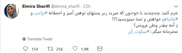 المیرا شریفی‌مقدم، مجری تلویزیون در توییتر نوشت: «شرم کنید. چند چندید با خودتون که میرید زیر پست‌های توهین‌آمیز و احمقانه ترامپ و نتانیاهو خواهش و تمنا مینویسید؟!؟ دِ آخه چقدر وطن فروشی؟ محترمانه میگم: سکوت کن.»