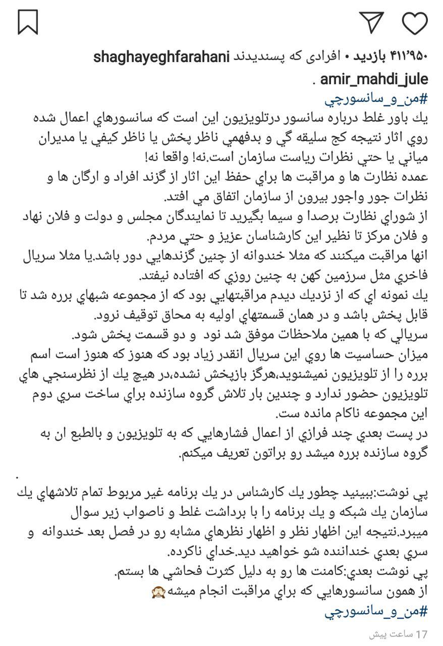 امیرمهدی ژوله که این روزها به خاطرات خود از سانسورهای تلویزیون می پردازد و کمپینی هم در این رابطه راه اندازی کرده است، فیلمی از انتقاد یکی از کارشناسان مذهبی تلویزیون را منتشر کرد و نوشت: «يك باور غلط درباره سانسور در تلويزيون اين است كه سانسورهاي اعمال شده روي آثار نتيجه كج سليقه گي و بدفهمي ناظر پخش يا ناظر كيفي يا مديران مياني يا حتي نظرات رياست سازمان است.نه! واقعا نه!